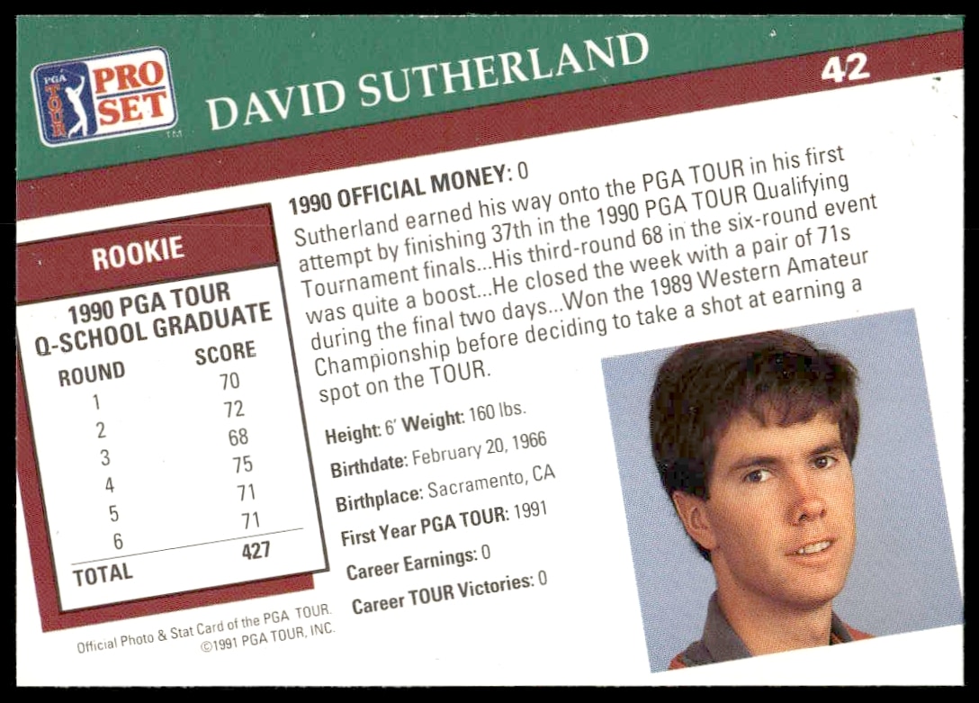 This Golf card, from 1991 is part of the Pro Set PGA Tour card set. David Sutherland is featured and has a card number of 42.