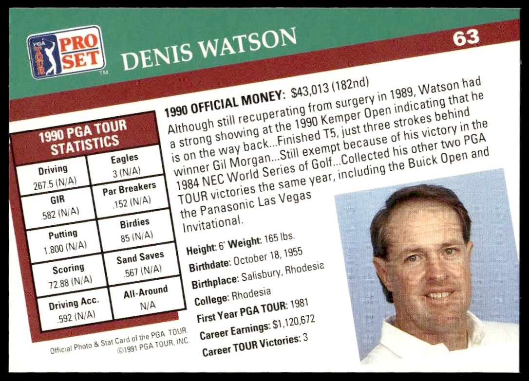 This Golf card, from 1991 is part of the Pro Set PGA Tour card set. Denis Watson is featured and has a card number of 63.