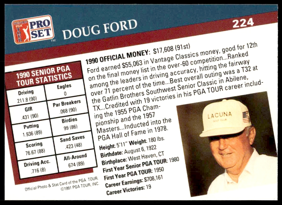 This Golf card, from 1991 is part of the Pro Set PGA Tour card set. Doug Ford is featured and has a card number of 224.