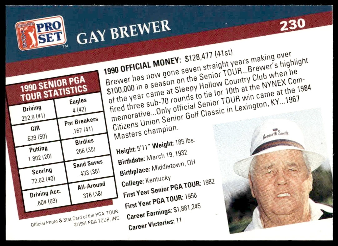 This Golf card, from 1991 is part of the Pro Set PGA Tour card set. Gay Brewer is featured and has a card number of 230.
