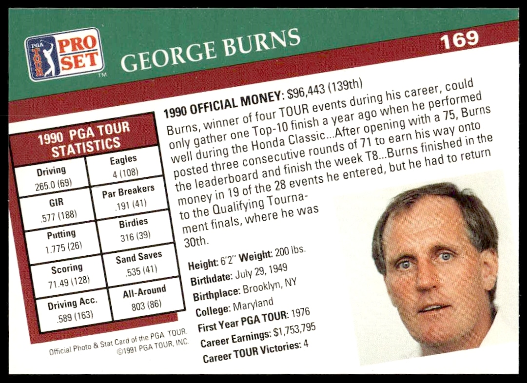 This Golf card, from 1991 is part of the Pro Set PGA Tour card set. George Burns is featured and has a card number of 169.
