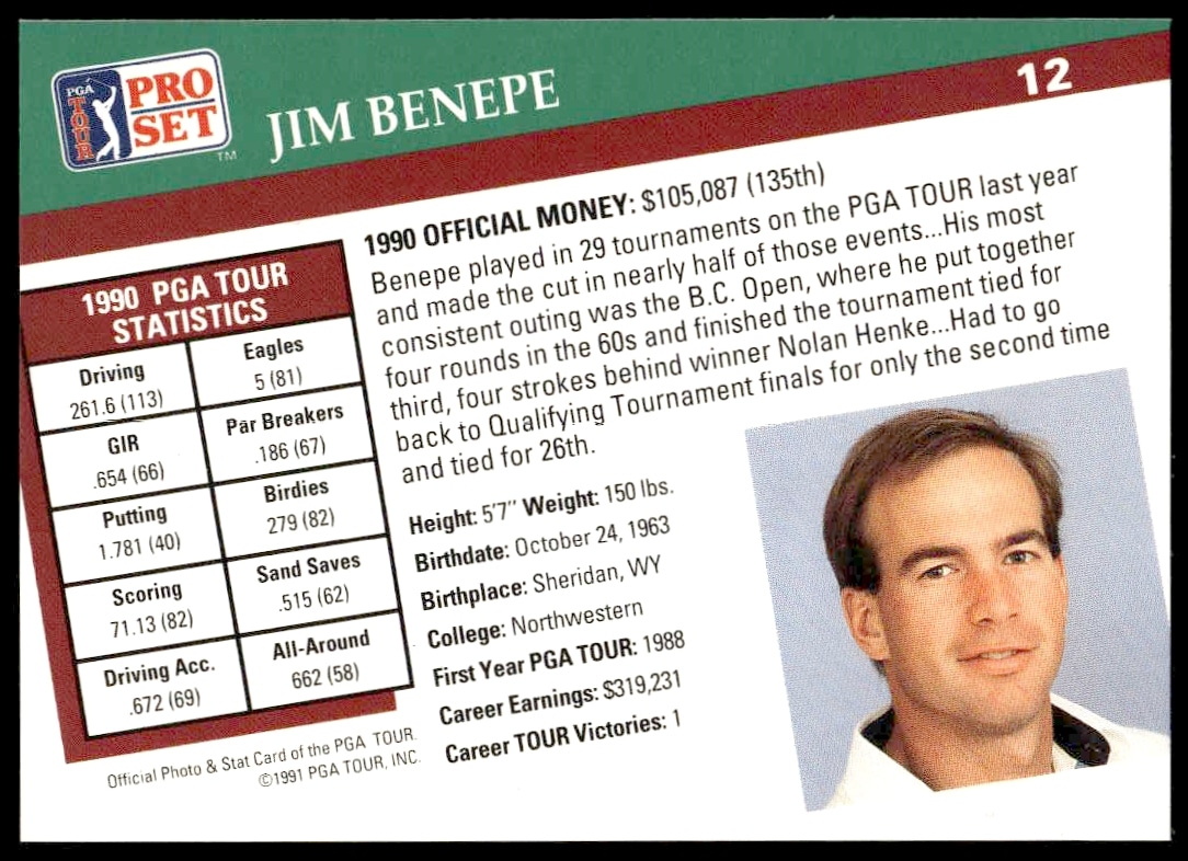 This Golf card, from 1991 is part of the Pro Set PGA Tour card set. Jim Benepe is featured and has a card number of 12.