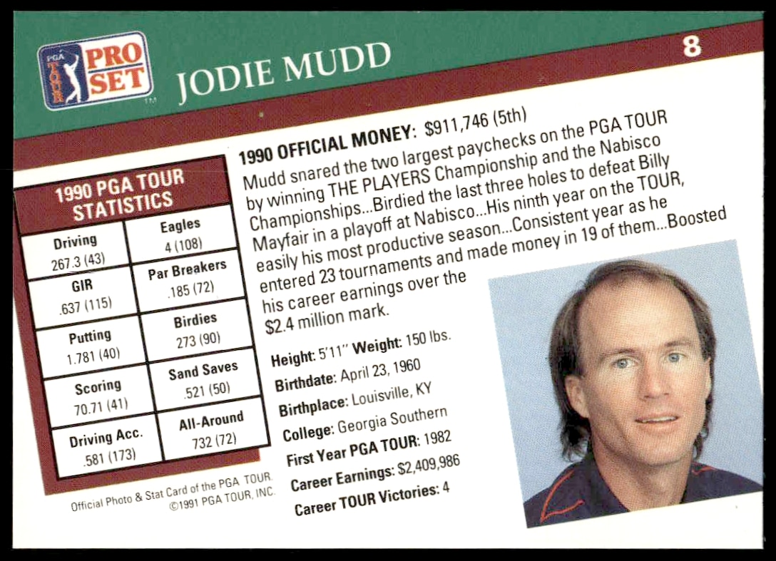 This Golf card, from 1991 is part of the Pro Set PGA Tour card set. Jodie Mudd is featured and has a card number of 8.
