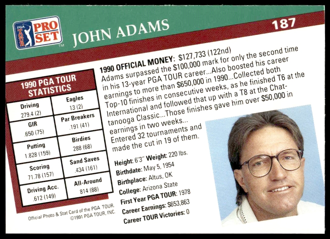 This Golf card, from 1991 is part of the Pro Set PGA Tour card set. John Adams is featured and has a card number of 187.