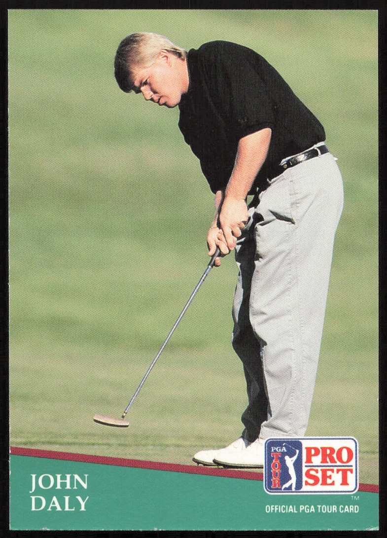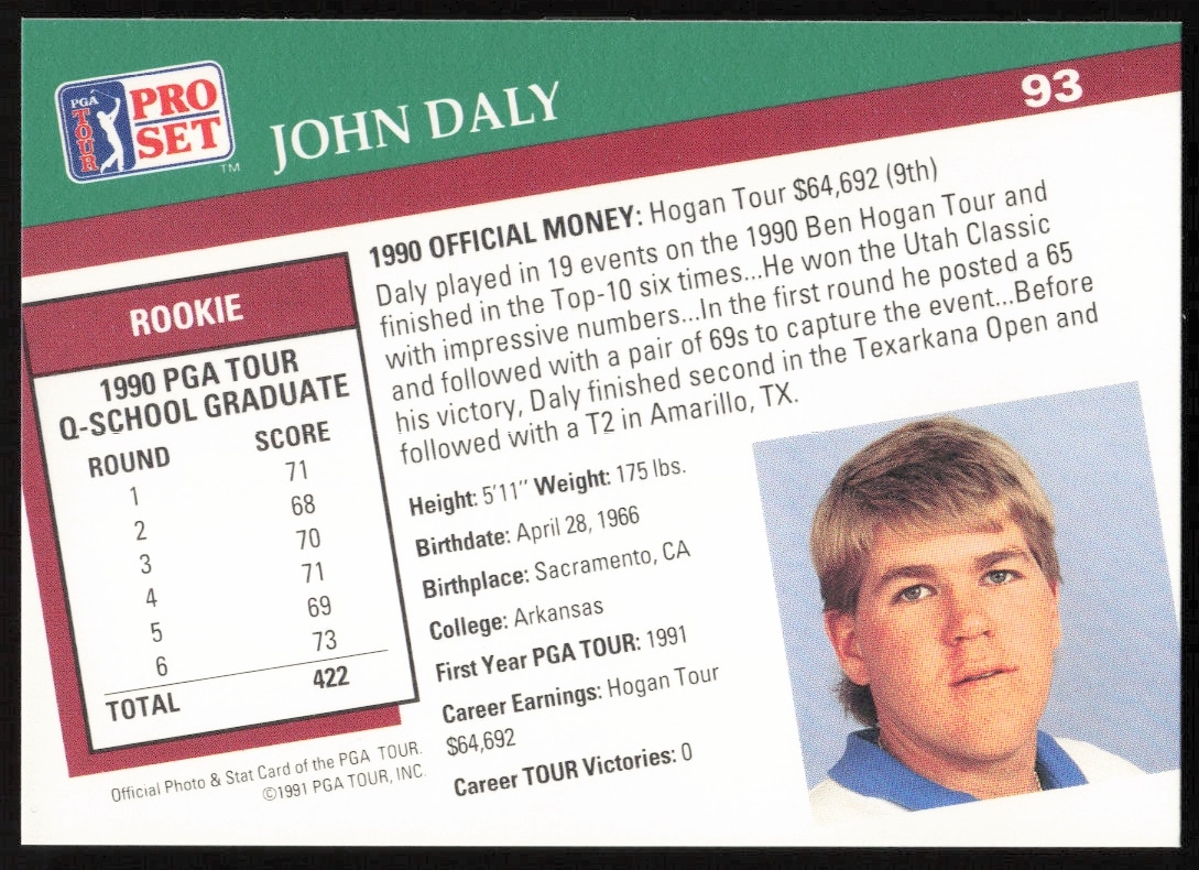This Golf card, from 1991 is part of the Pro Set PGA Tour card set. John Daly is featured and has a card number of 93.