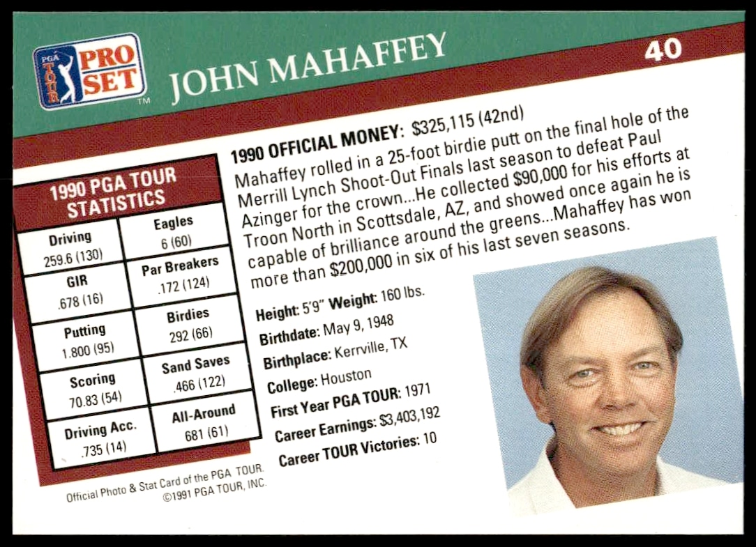 This Golf card, from 1991 is part of the Pro Set PGA Tour card set. John Mahaffey is featured and has a card number of 40.