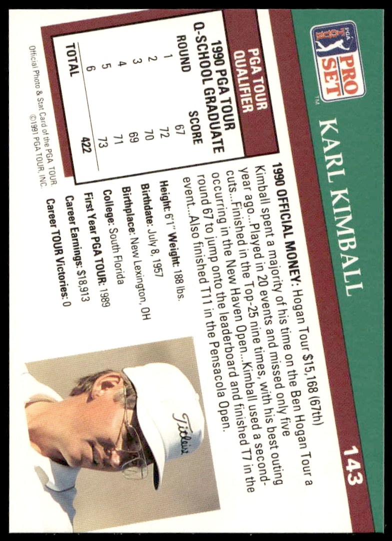 This Golf card, from 1991 is part of the Pro Set PGA Tour card set. Karl Kimball is featured and has a card number of 143.
