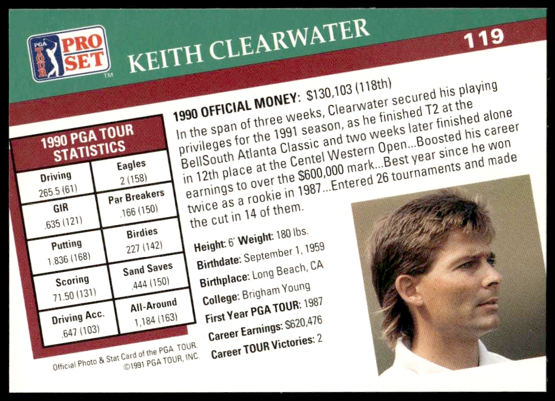 This Golf card, from 1991 is part of the Pro Set PGA Tour card set. Keith Clearwater is featured and has a card number of 119.