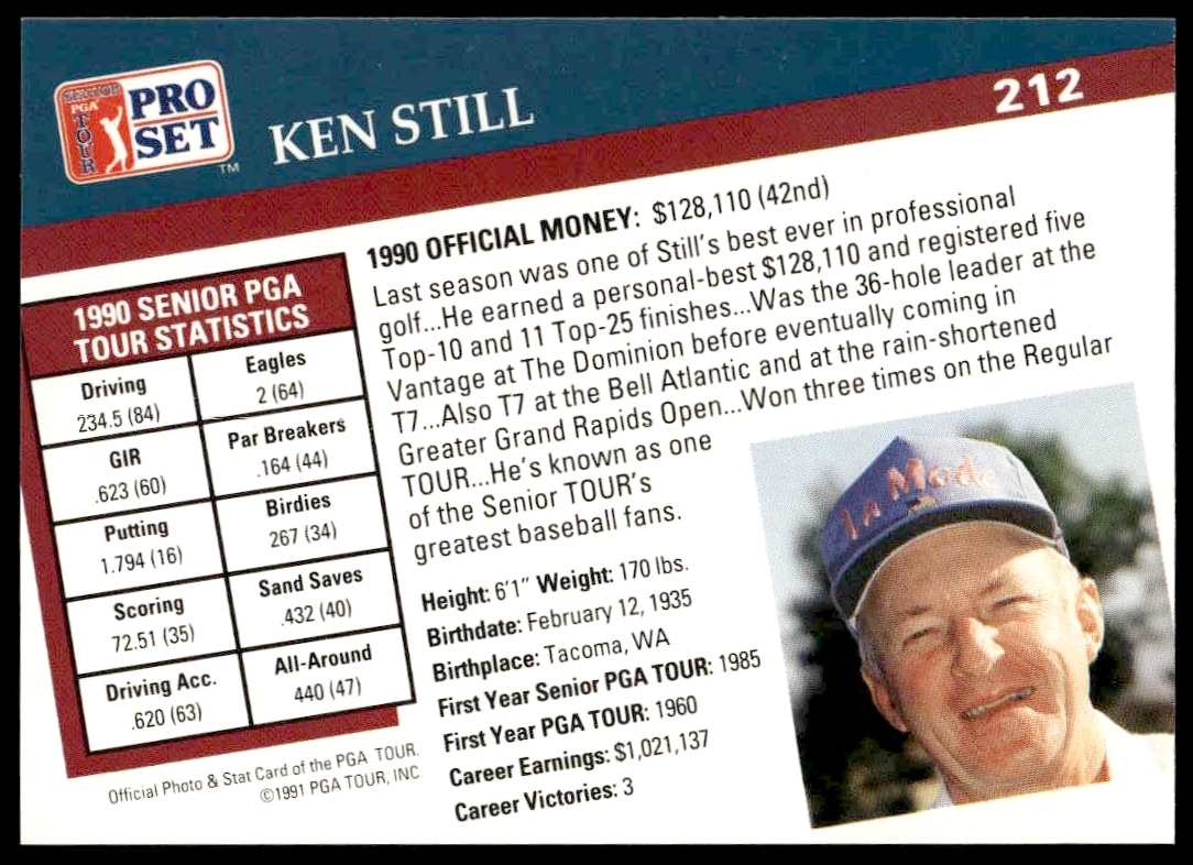 This Golf card, from 1991 is part of the Pro Set PGA Tour card set. Ken Still is featured and has a card number of 212.