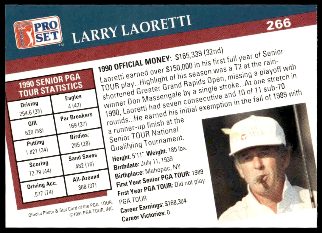 This Golf card, from 1991 is part of the Pro Set PGA Tour card set. Larry Laoretti is featured and has a card number of 266.