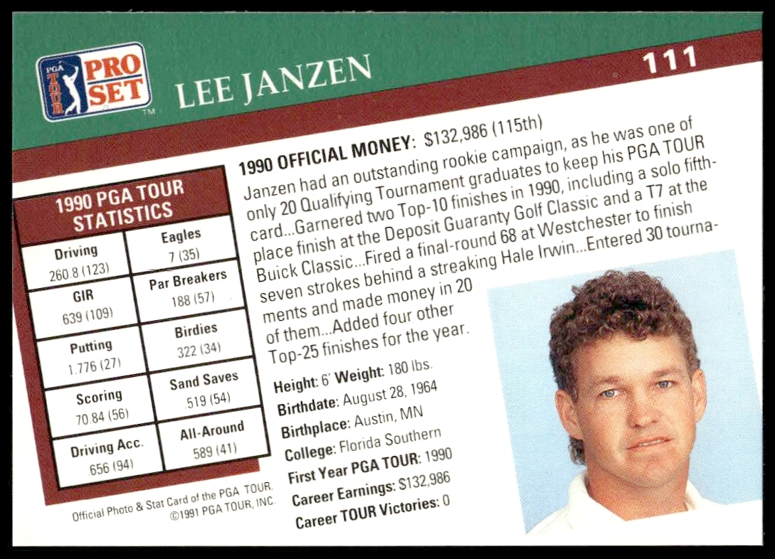 This Golf card, from 1991 is part of the Pro Set PGA Tour card set. Lee Janzen is featured and has a card number of 111.