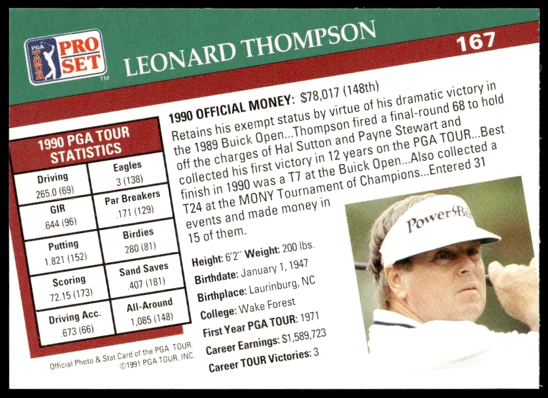 This Golf card, from 1991 is part of the Pro Set PGA Tour card set. Leonard Thompson is featured and has a card number of 167.