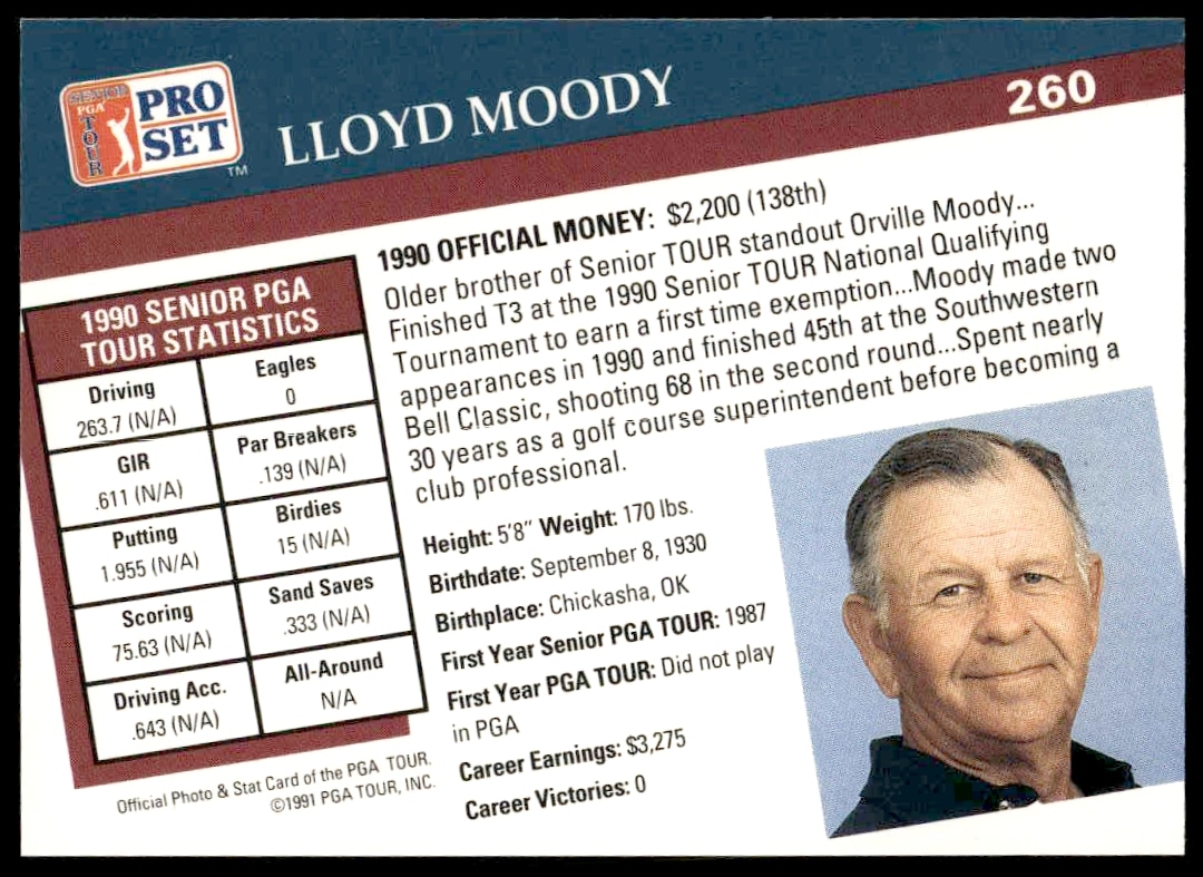 This Golf card, from 1991 is part of the Pro Set PGA Tour card set. Lloyd Moody is featured and has a card number of 260.