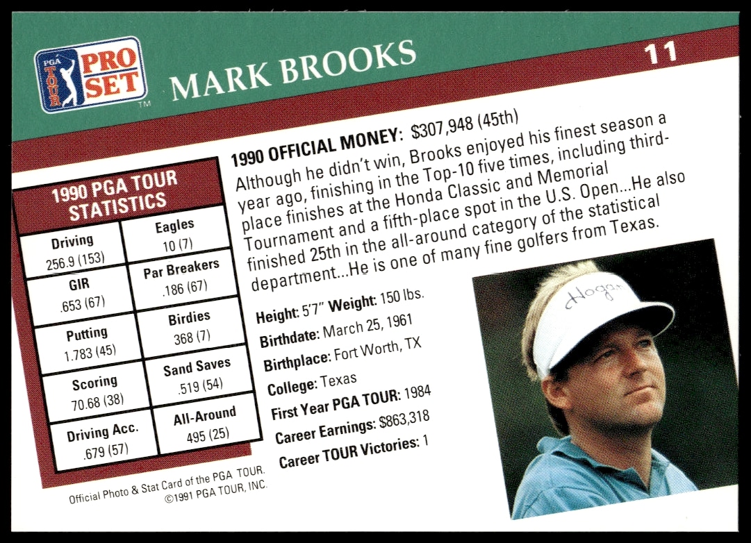This Golf card, from 1991 is part of the Pro Set PGA Tour card set. Mark Brooks is featured and has a card number of 11.