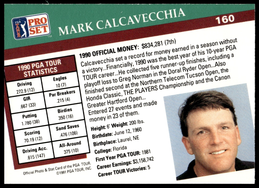 This Golf card, from 1991 is part of the Pro Set PGA Tour card set. Mark Calcavecchia is featured and has a card number of 160.