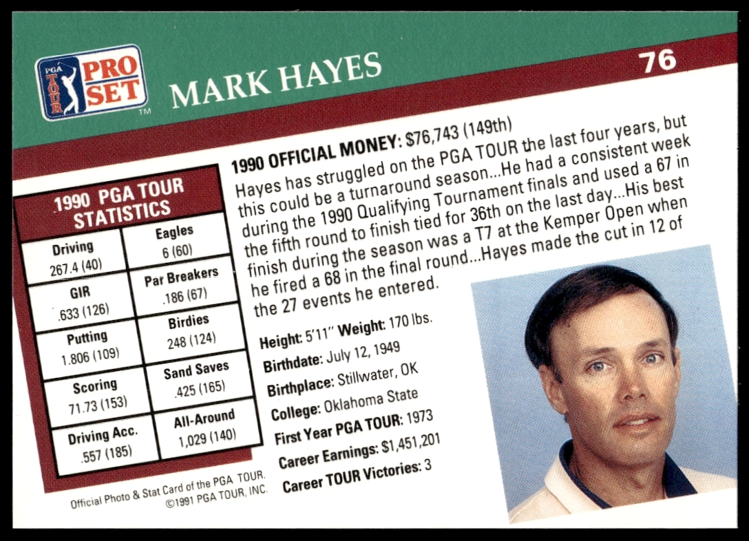 This Golf card, from 1991 is part of the Pro Set PGA Tour card set. Mark Hayes is featured and has a card number of 76.