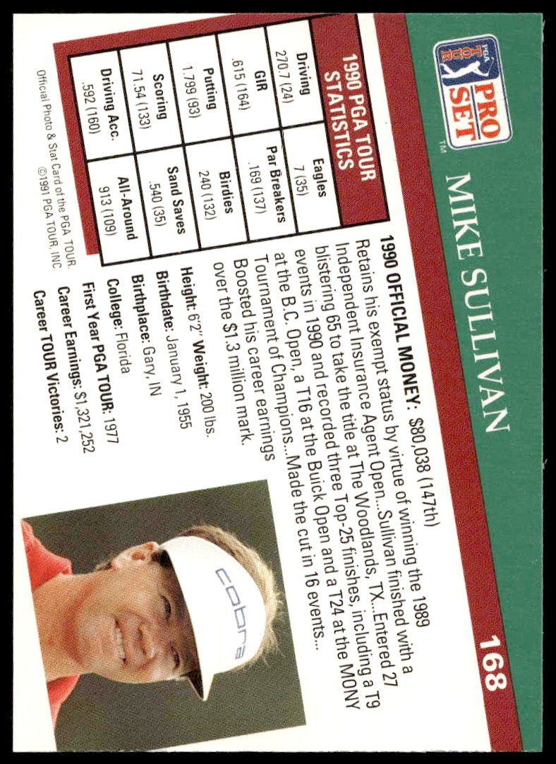 This Golf card, from 1991 is part of the Pro Set PGA Tour card set. Mike Sullivan is featured and has a card number of 168.