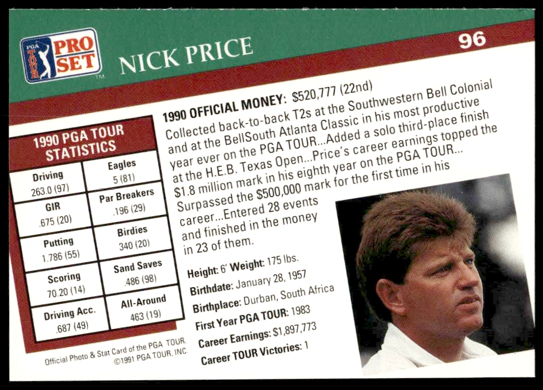 This Golf card, from 1991 is part of the Pro Set PGA Tour card set. Nick Price is featured and has a card number of 96.
