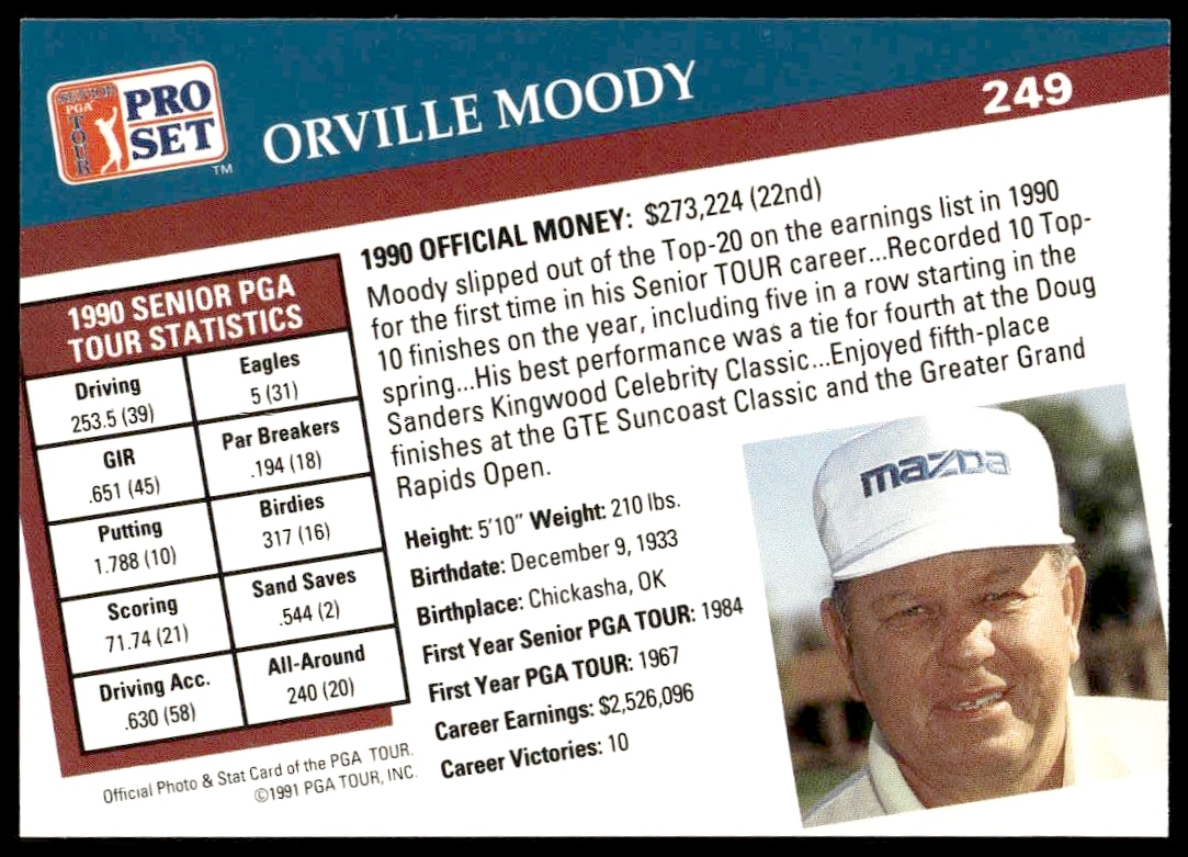 This Golf card, from 1991 is part of the Pro Set PGA Tour card set. Orville Moody is featured and has a card number of 249.