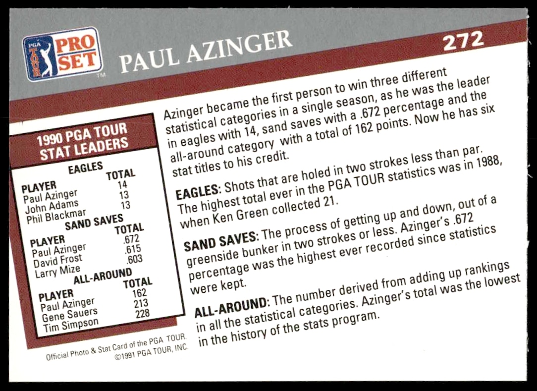 This Golf card, from 1991 is part of the Pro Set PGA Tour card set. Paul Azinger is featured and has a card number of 272.