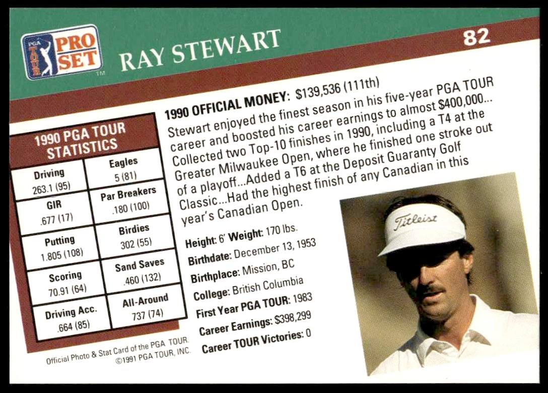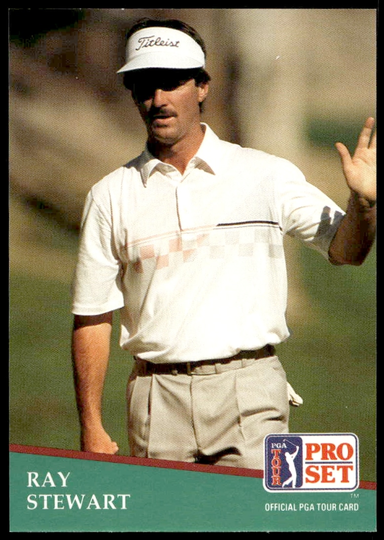 This Golf card, from 1991 is part of the Pro Set PGA Tour card set. Ray Stewart is featured and has a card number of 82.