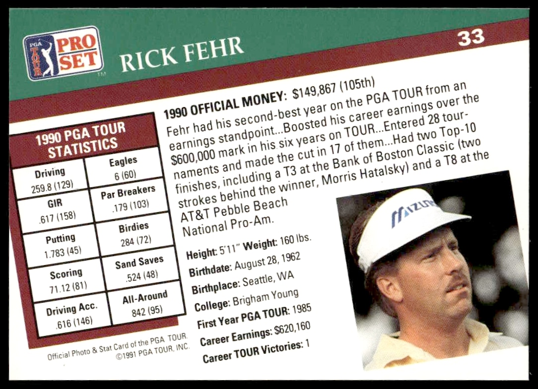 This Golf card, from 1991 is part of the Pro Set PGA Tour card set. Rick Fehr is featured and has a card number of 33.