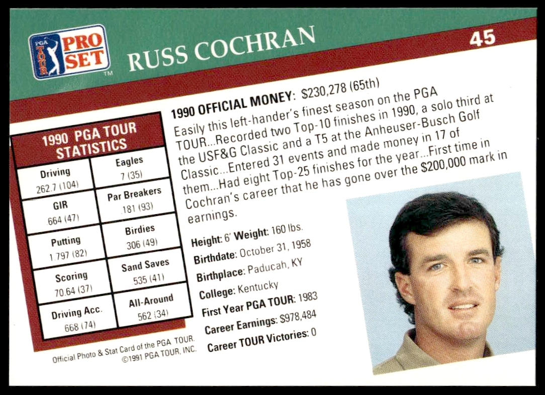 This Golf card, from 1991 is part of the Pro Set PGA Tour card set. Russ Cochran is featured and has a card number of 45.