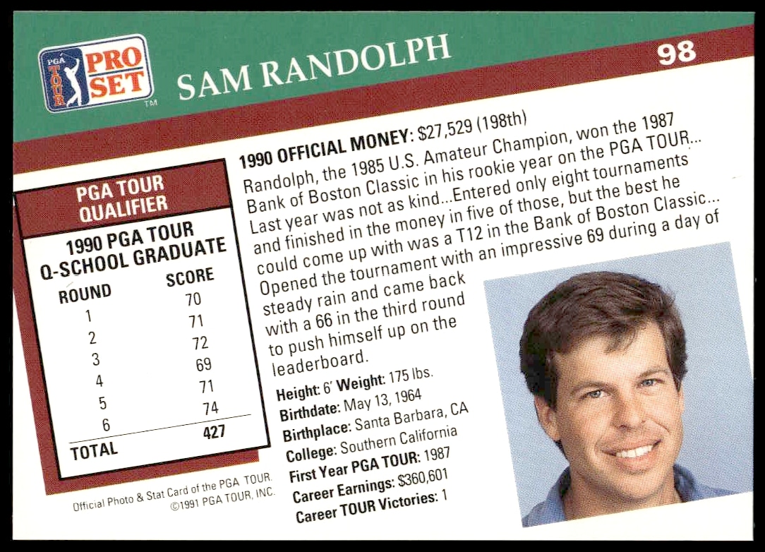 This Golf card, from 1991 is part of the Pro Set PGA Tour card set. Sam Randolph is featured and has a card number of 98.