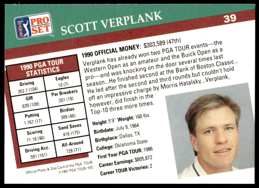 This Golf card, from 1991 is part of the Pro Set PGA Tour card set. Scott Verplank is featured and has a card number of 39.