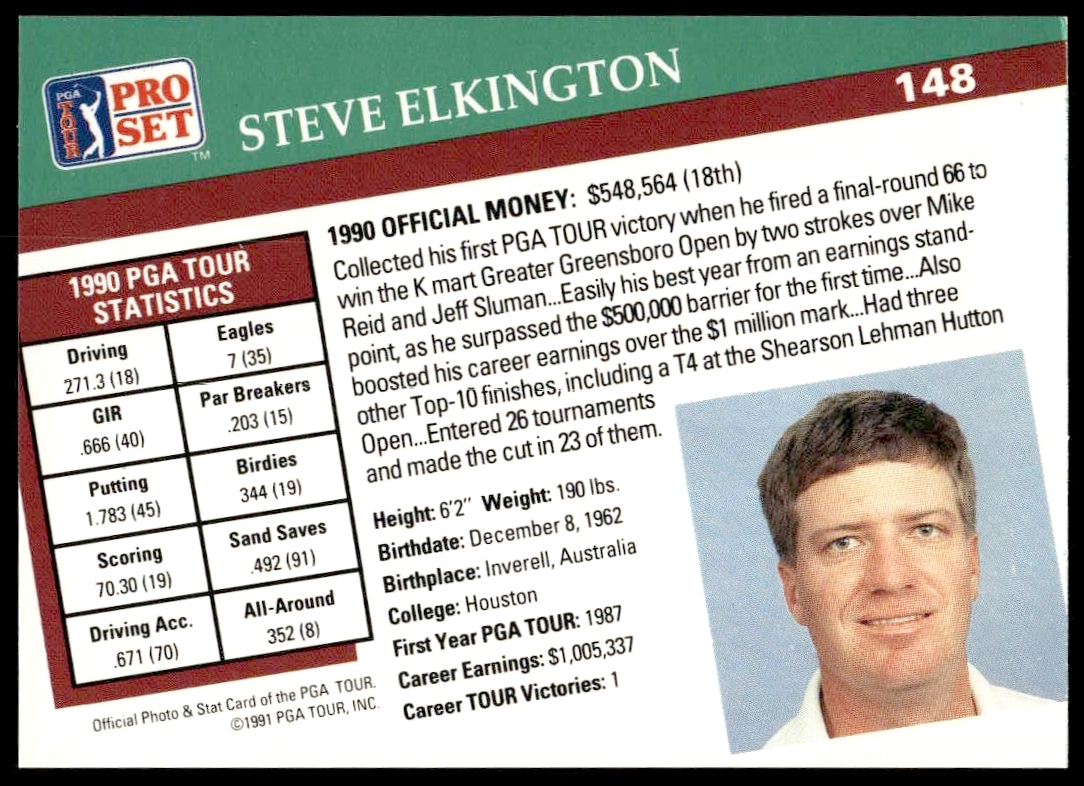 This Golf card, from 1991 is part of the Pro Set PGA Tour card set. Steve Elkington is featured and has a card number of 148.