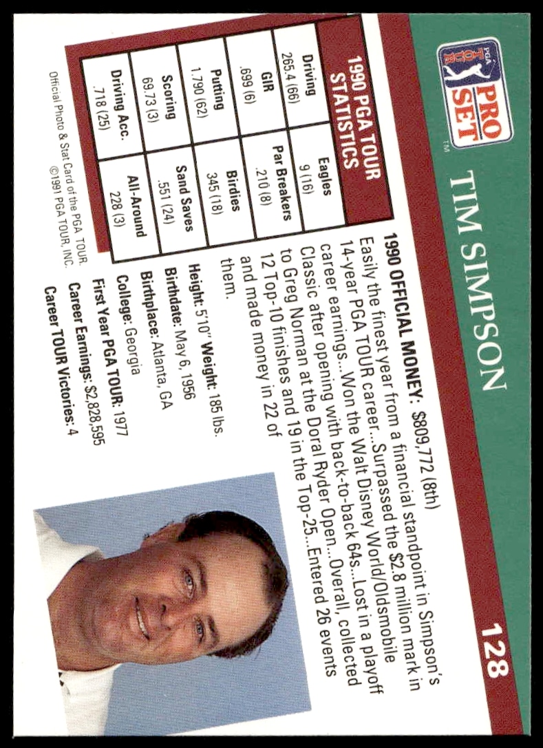 This Golf card, from 1991 is part of the Pro Set PGA Tour card set. Tim Simpson is featured and has a card number of 128.