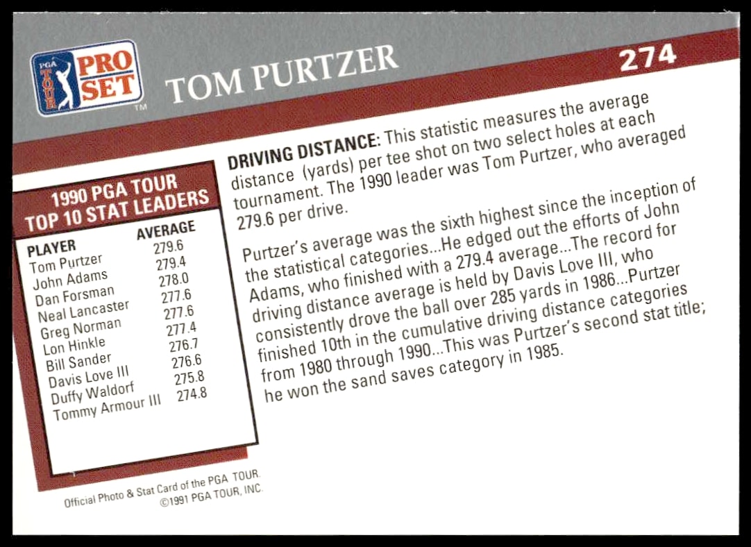 Home Β» 1991 Pro Set PGA Tour Tom Purtzer Statistical Leader #274