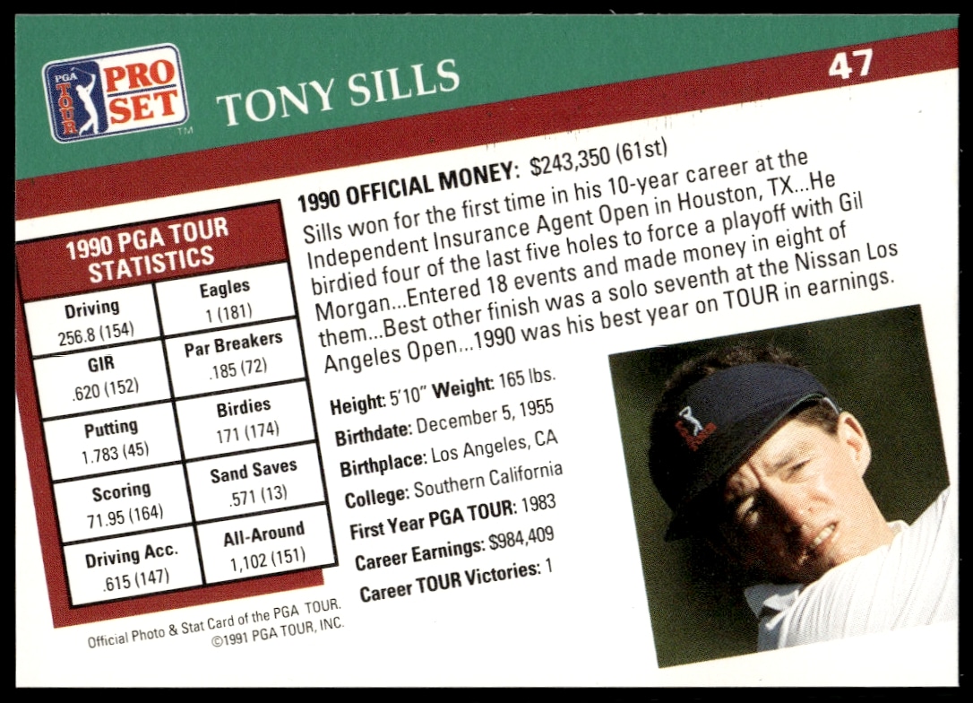 This Golf card, from 1991 is part of the Pro Set PGA Tour card set. Tony Sills is featured and has a card number of 47.
