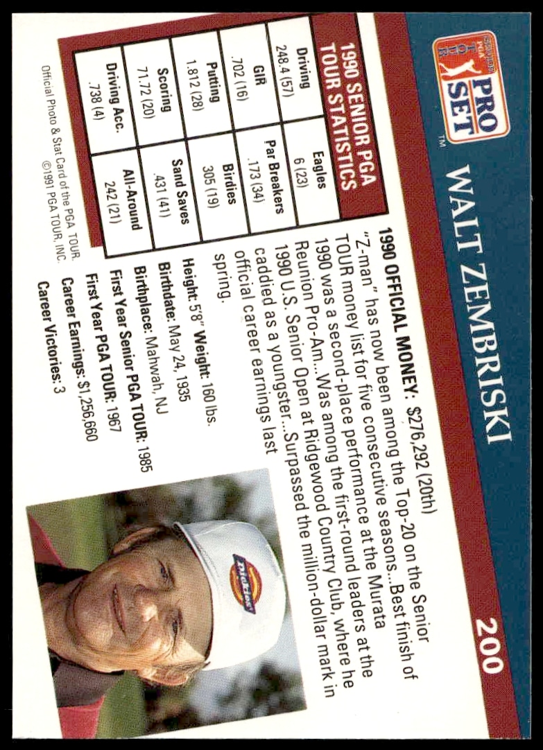 This Golf card, from 1991 is part of the Pro Set PGA Tour card set. Walt Zembriski is featured and has a card number of 200.