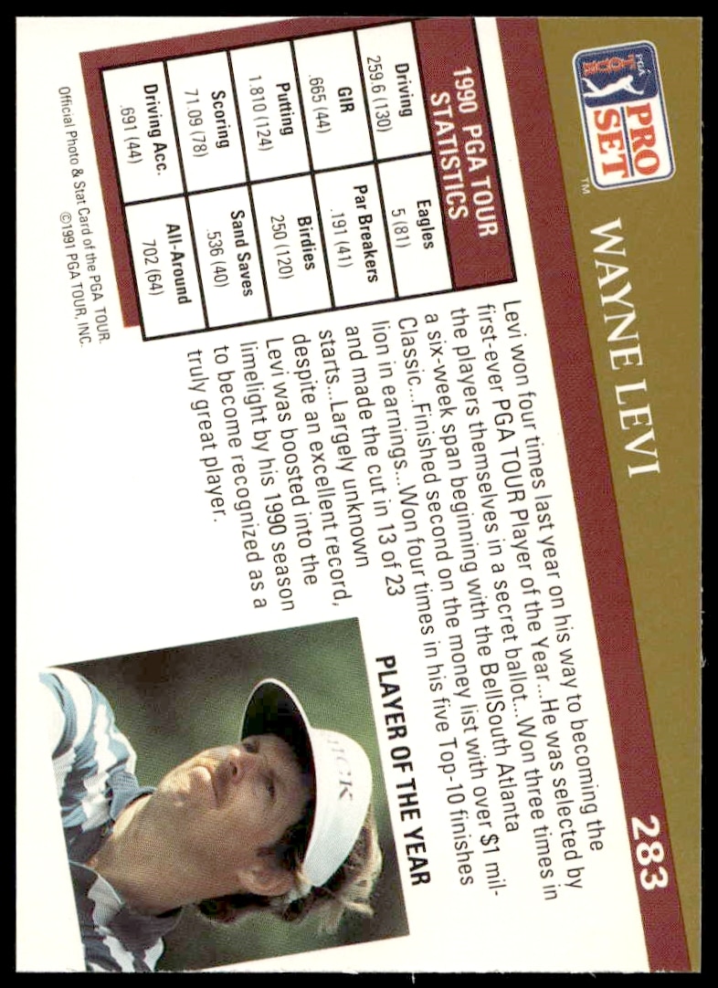 This Golf card, from 1991 is part of the Pro Set PGA Tour card set. Wayne Levi is featured and has a card number of 283.
