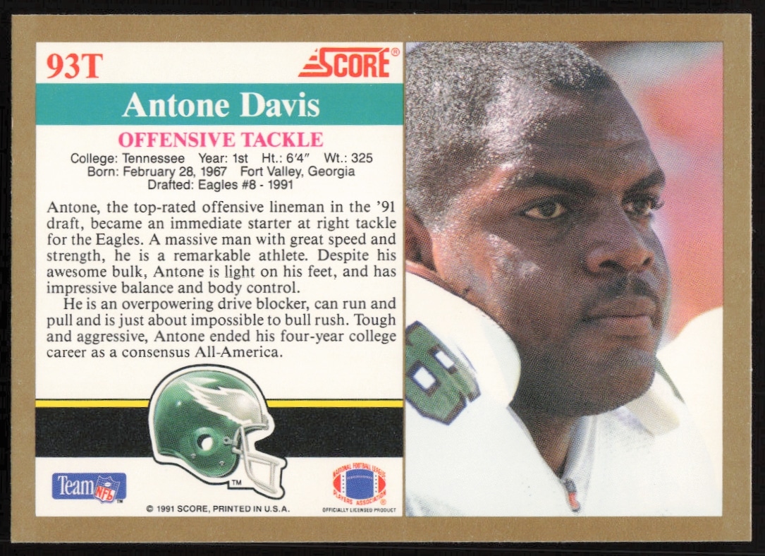 This Football card, from 1991 is part of the Score Supplemental card set. Antone Davis is featured and has a card number of 93T.