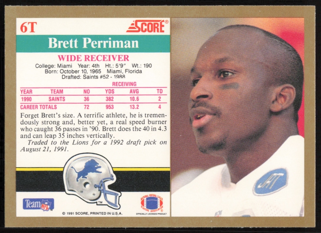 This Football card, from 1991 is part of the Score Supplemental card set. Brett Perriman is featured and has a card number of 6T.