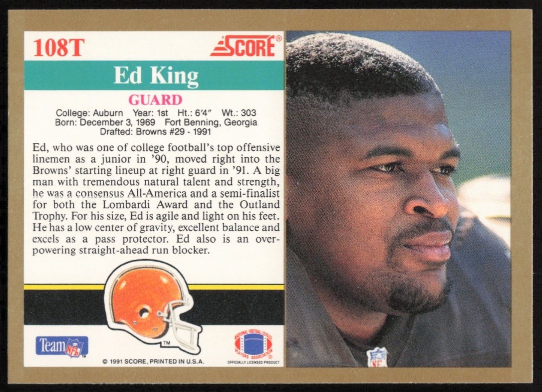 This Football card, from 1991 is part of the Score Supplemental card set. Ed King is featured and has a card number of 108T.