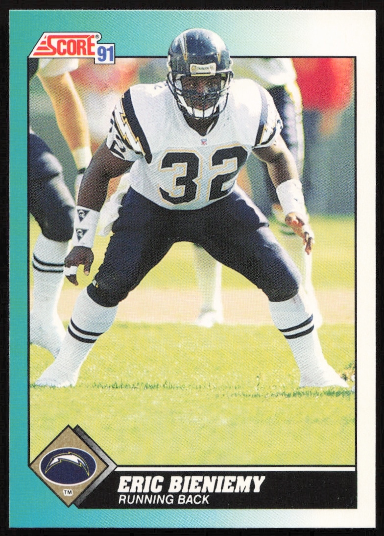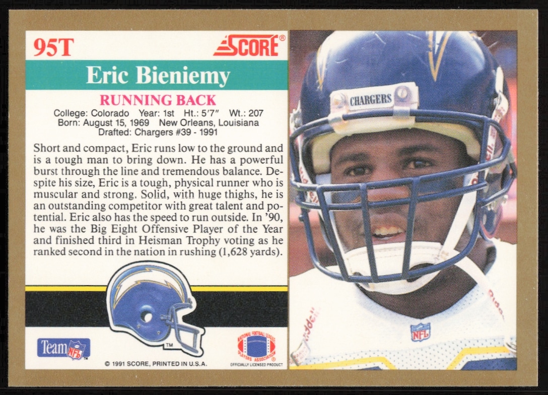 This Football card, from 1991 is part of the Score Supplemental card set. Eric Bieniemy is featured and has a card number of 95T.