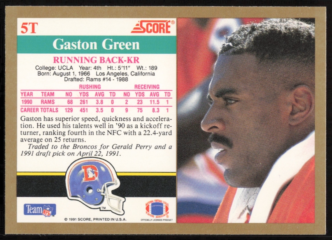 This Football card, from 1991 is part of the Score Supplemental card set. Gaston Green is featured and has a card number of 5T.