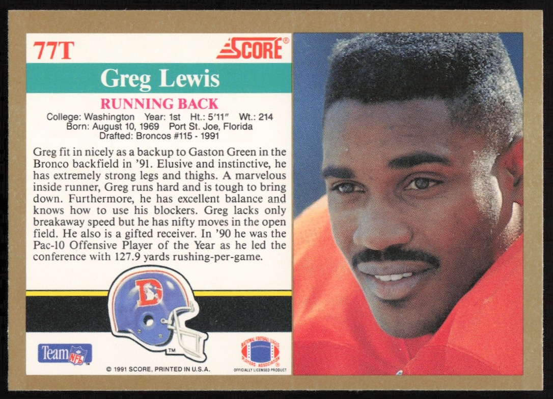 This Football card, from 1991 is part of the Score Supplemental card set. Greg Lewis is featured and has a card number of 77T.