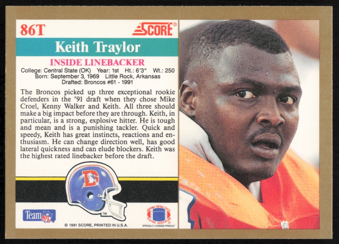 This Football card, from 1991 is part of the Score Supplemental card set. Keith Traylor is featured and has a card number of 86T.