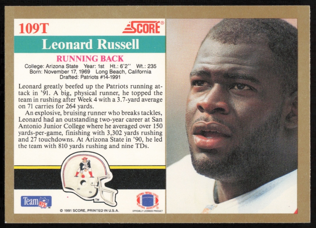 This Football card, from 1991 is part of the Score Supplemental card set. Leonard Russell is featured and has a card number of 109T.