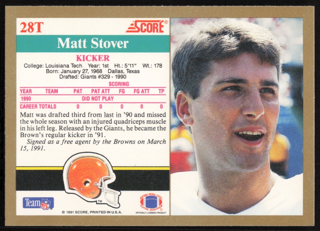 This Football card, from 1991 is part of the Score Supplemental card set. Matt Stover is featured and has a card number of 28T.