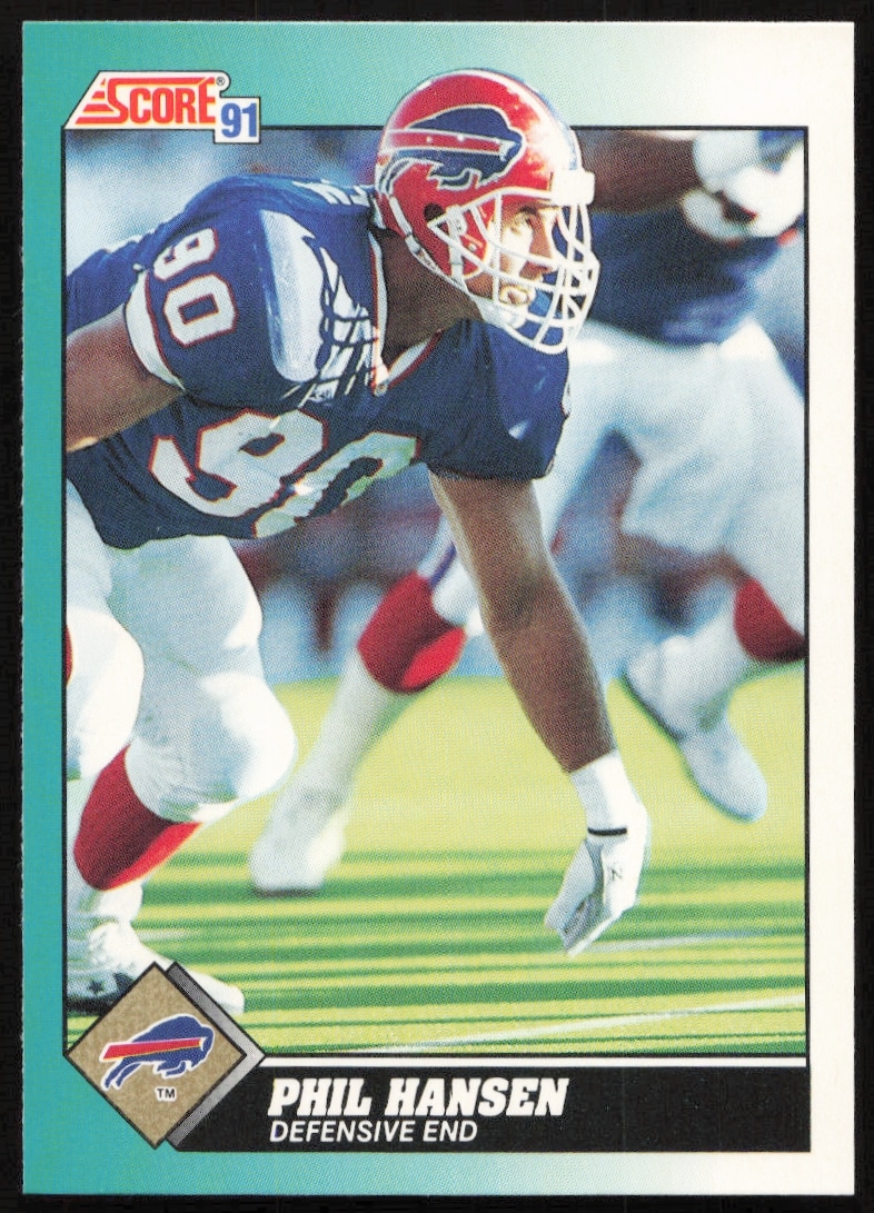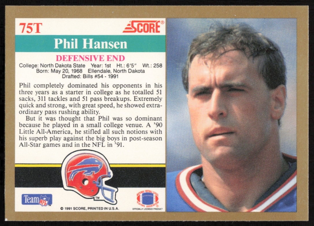 This Football card, from 1991 is part of the Score Supplemental card set. Phil Hansen is featured and has a card number of 75T.