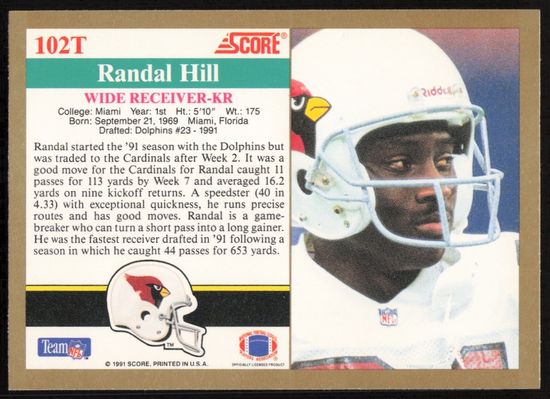 This Football card, from 1991 is part of the Score Supplemental card set. Randal Hill is featured and has a card number of 102T.