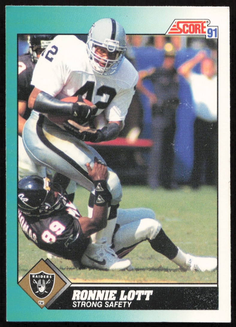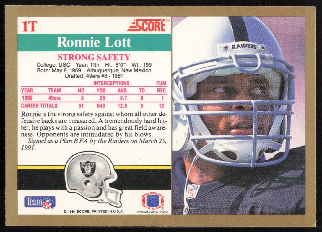 This Football card, from 1991 is part of the Score Supplemental card set. Ronnie Lott is featured and has a card number of 1T.