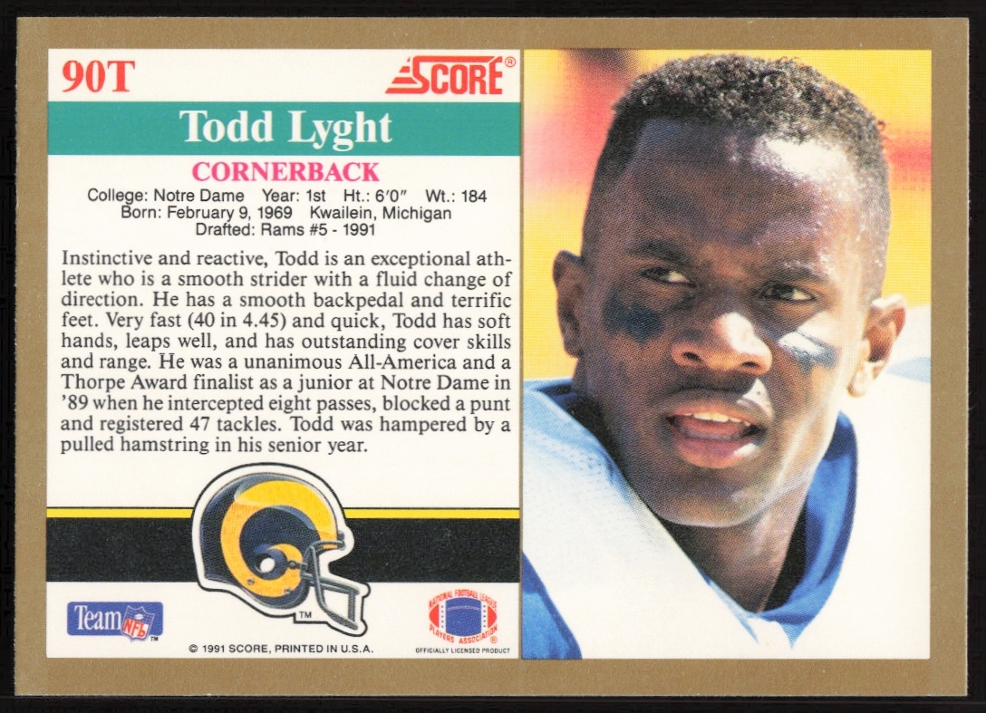 This Football card, from 1991 is part of the Score Supplemental card set. Todd Lyght is featured and has a card number of 90T.