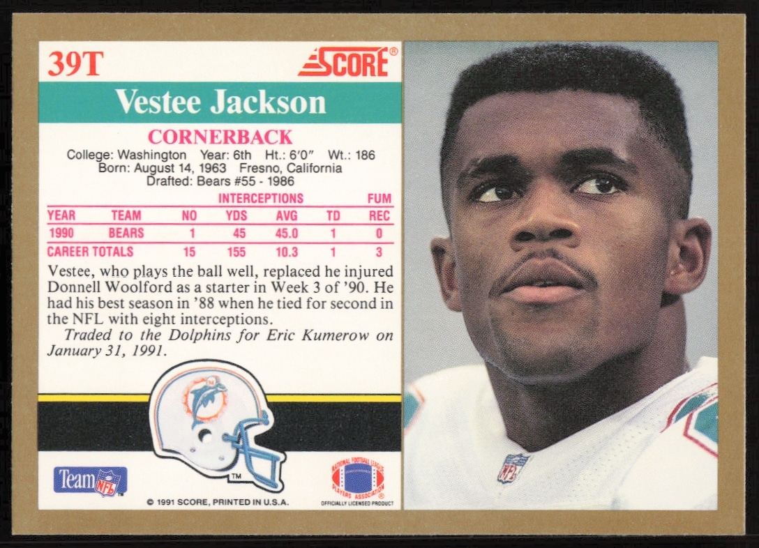 This Football card, from 1991 is part of the Score Supplemental card set. Vestee Jackson is featured and has a card number of 39T.