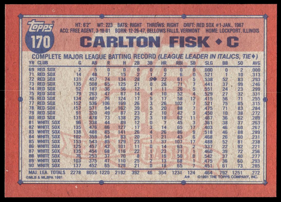 This Baseball card, from 1991 is part of the Topps  card set. Carlton Fisk is featured and has a card number of 170.